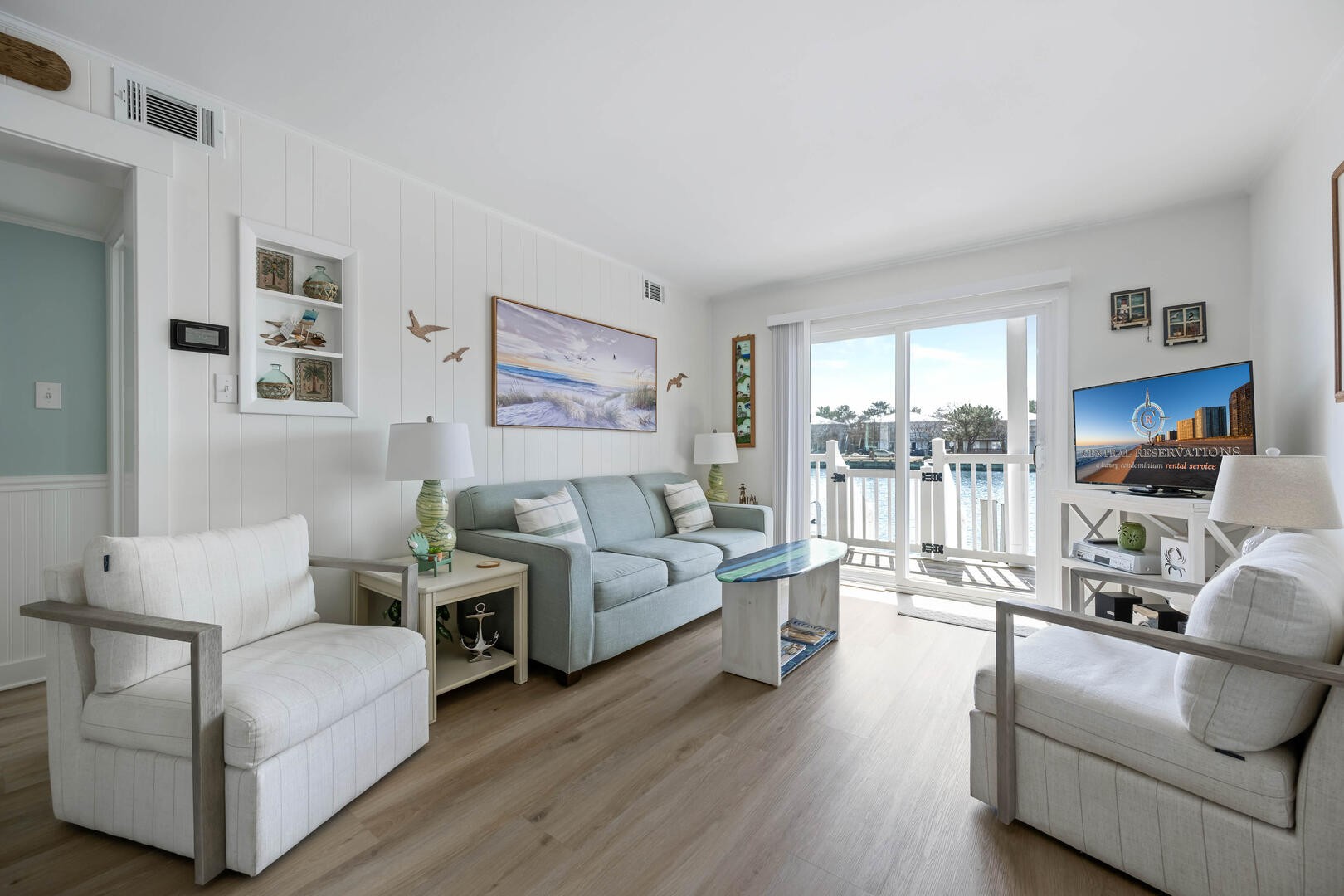 Welcome to Bayshore Estates North. Its time to book your vacation for your family of 8 at this adorable Bayside Canal Condo featuring 3 bedrooms, 2 Baths, lots of deck space for outdoor dining & entertaining. The living room & master bedroom have sliding glass doors with access to the balcony overlooking the canal. Enjoy cooking in the fully equipped kitchen. The living room has a new queen sleeper sofa (2023). The Master Bedroom features a king bed, private ensuite with stall shower, tv, ceiling fan & private access to balcony. The 2nd Bedroom offers a queen bed & ceiling fan. The 3 bedroom has a queen bed & ceiling fan. The hall bath has a tub/shower combo. There is a washer & dryer, streaming tv ( HBO Max, Netflix, Youtube) & complimentary wifi for your added convenience. Boat slip will accommodate a 22 foot boat. Hose available for boat cleaning. 1 assigned parking spot & one shared parking spot on a first come, first serve basis. Property rents any 7 nights in season and any 3 nights off season.