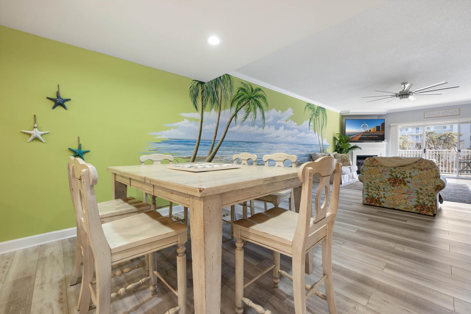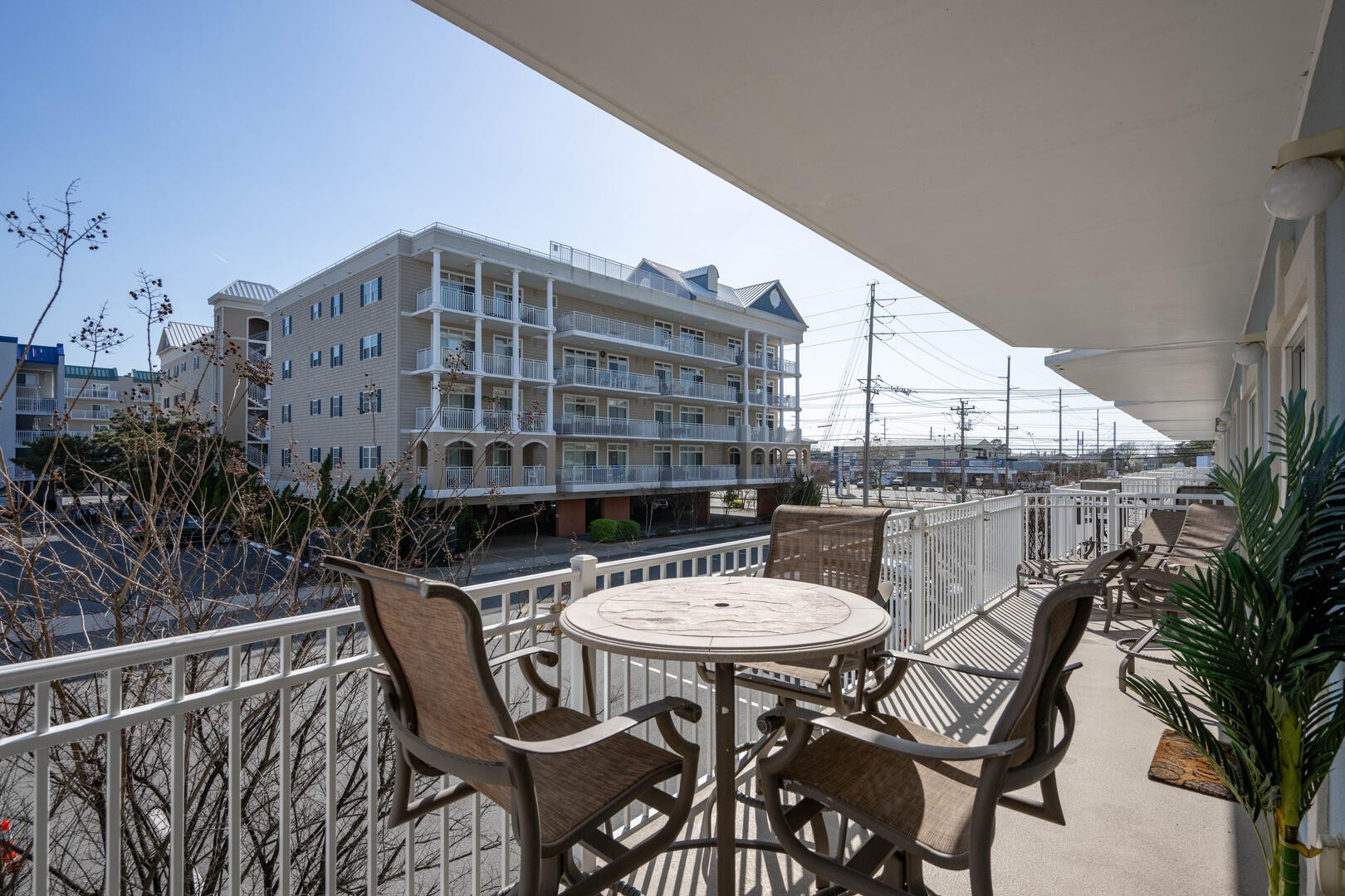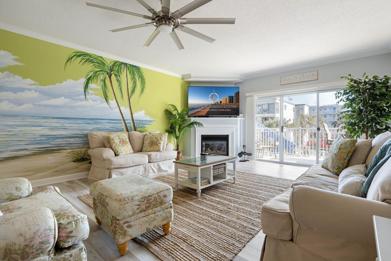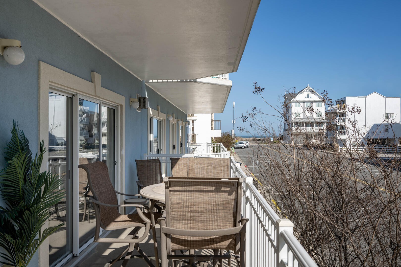The expansive 37-foot balcony stretches across the living area, offering some ocean views and the perfect place to enjoy morning coffee or unwind after a sun-filled day. Inside, the oversized living room features crown molding, a cozy gas fireplace, a queen-size sleeper sofa for additional guests, and ample comfortable seating to gather together. The updated kitchen is equipped with stainless steel appliances and generous counter space, making meal preparation easy whether you're cooking for a crowd or just reheating boardwalk treats. Just off the kitchen, the large dining area includes two tables plus barstools at the counter, giving everyone a place to sit, eat, and reconnect after a full day at the beach.