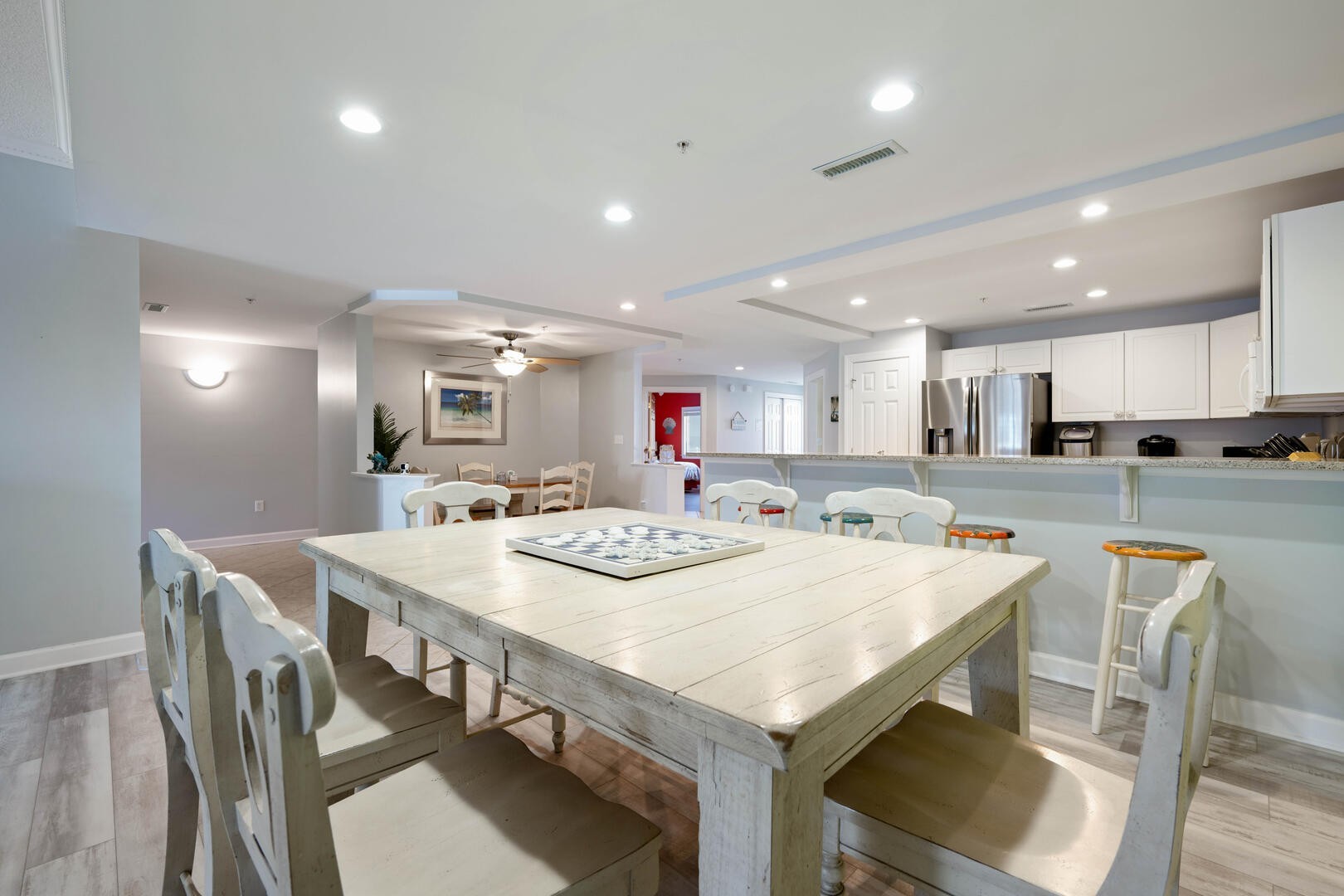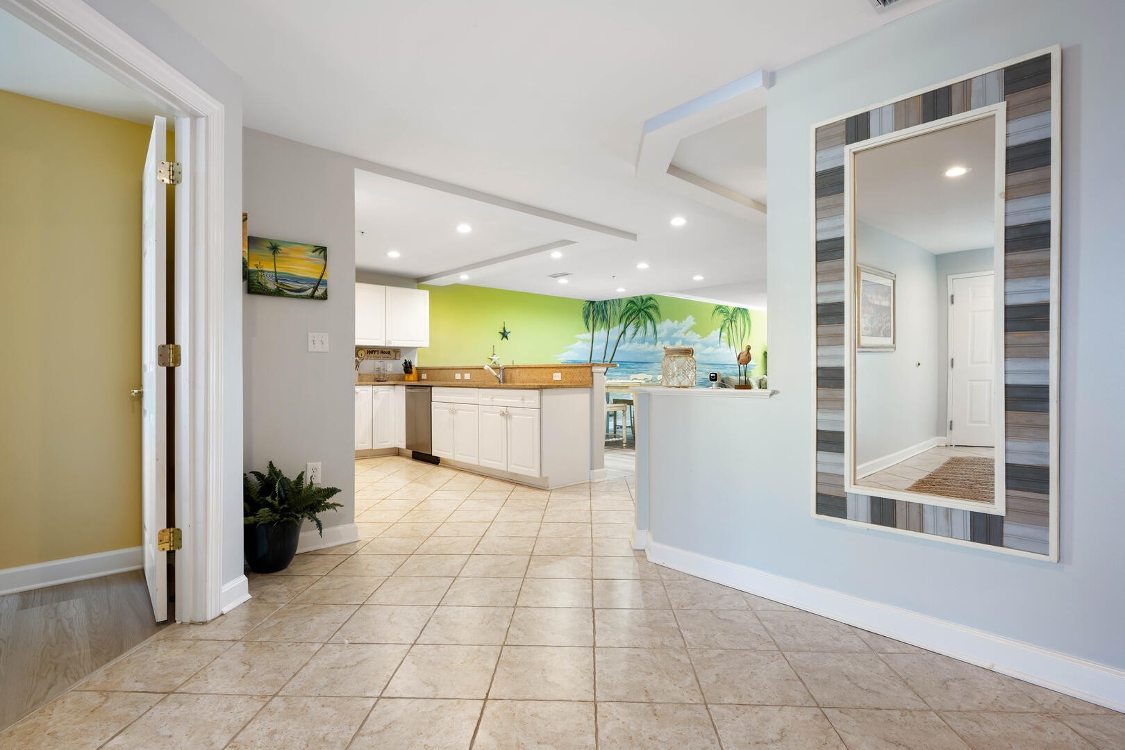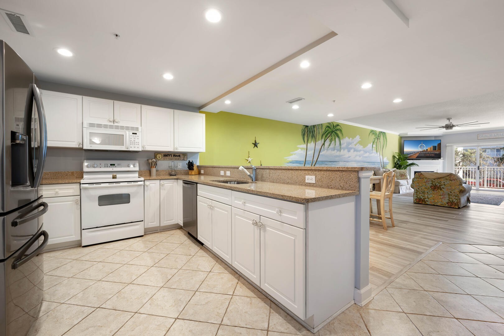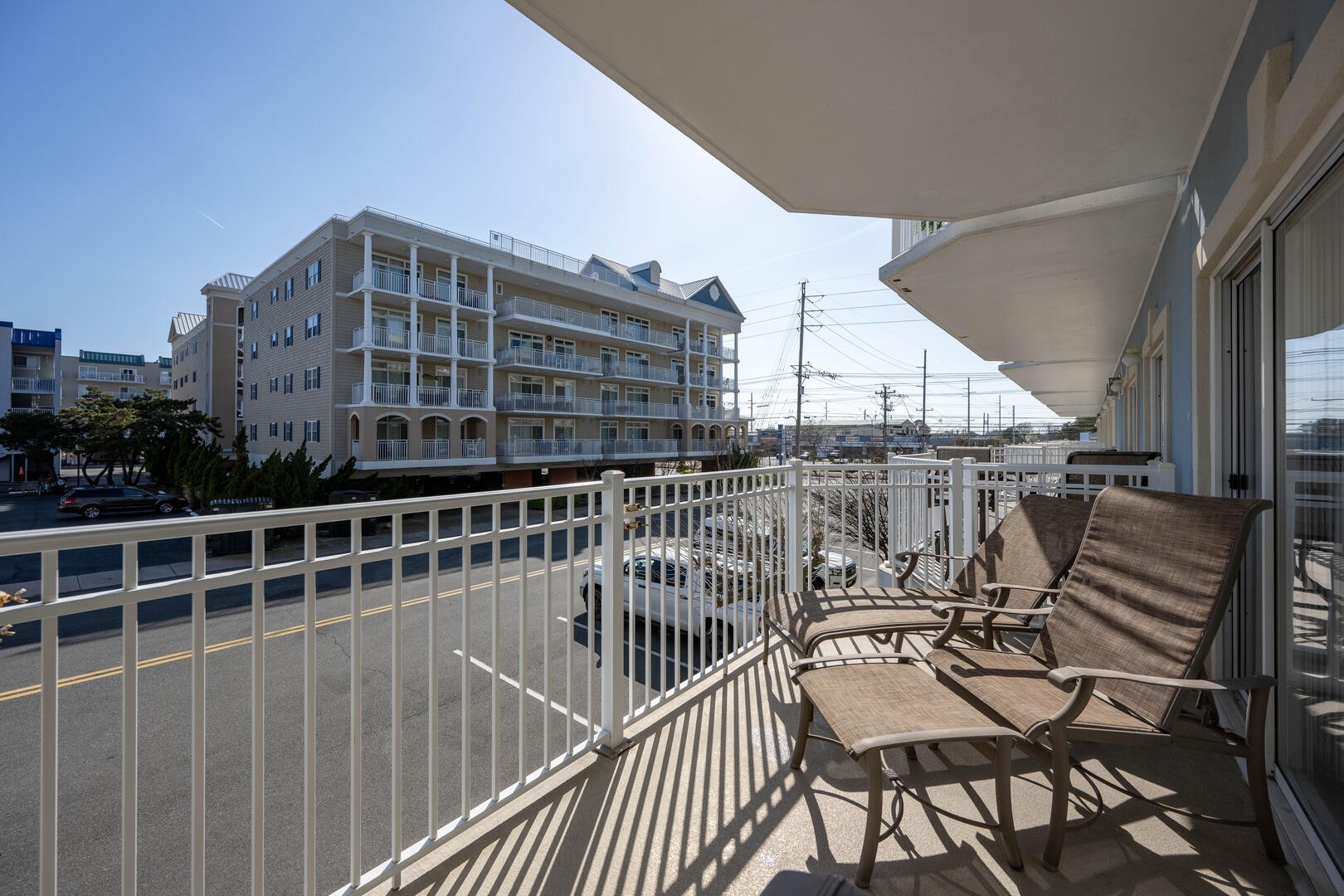 The expansive 37-foot balcony stretches across the living area, offering some ocean views and the perfect place to enjoy morning coffee or unwind after a sun-filled day. Inside, the oversized living room features crown molding, a cozy gas fireplace, a queen-size sleeper sofa for additional guests, and ample comfortable seating to gather together. The updated kitchen is equipped with stainless steel appliances and generous counter space, making meal preparation easy whether you're cooking for a crowd or just reheating boardwalk treats. Just off the kitchen, the large dining area includes two tables plus barstools at the counter, giving everyone a place to sit, eat, and reconnect after a full day at the beach.
