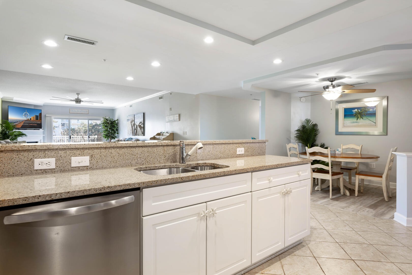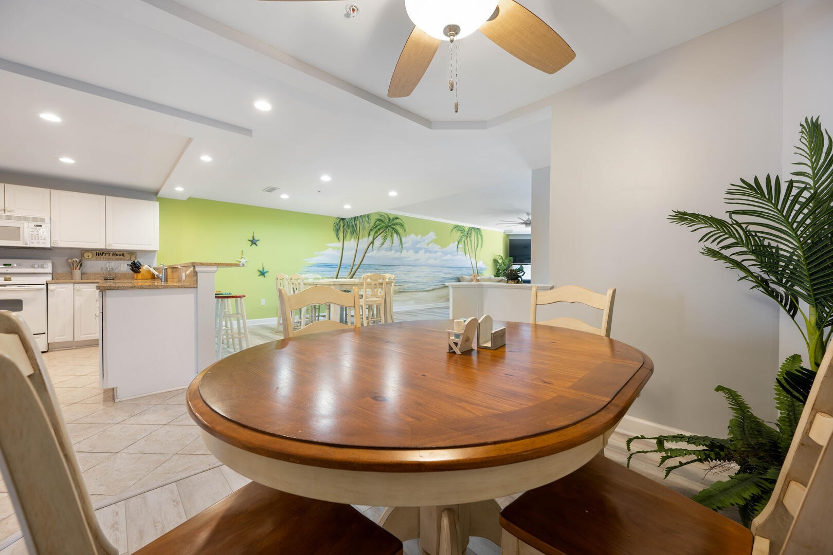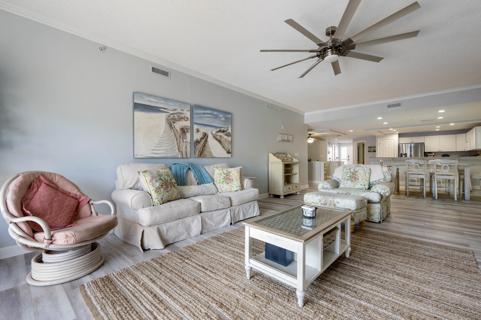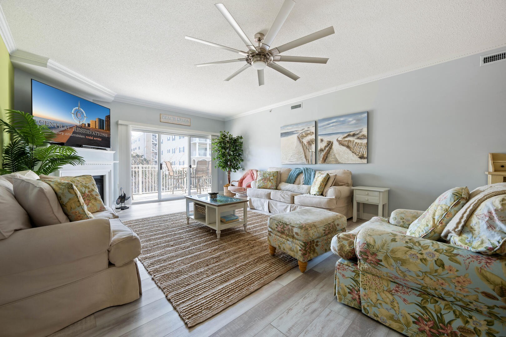 The expansive 37-foot balcony stretches across the living area, offering some ocean views and the perfect place to enjoy morning coffee or unwind after a sun-filled day. Inside, the oversized living room features crown molding, a cozy gas fireplace, a queen-size sleeper sofa for additional guests, and ample comfortable seating to gather together. The updated kitchen is equipped with stainless steel appliances and generous counter space, making meal preparation easy whether you're cooking for a crowd or just reheating boardwalk treats. Just off the kitchen, the large dining area includes two tables plus barstools at the counter, giving everyone a place to sit, eat, and reconnect after a full day at the beach.