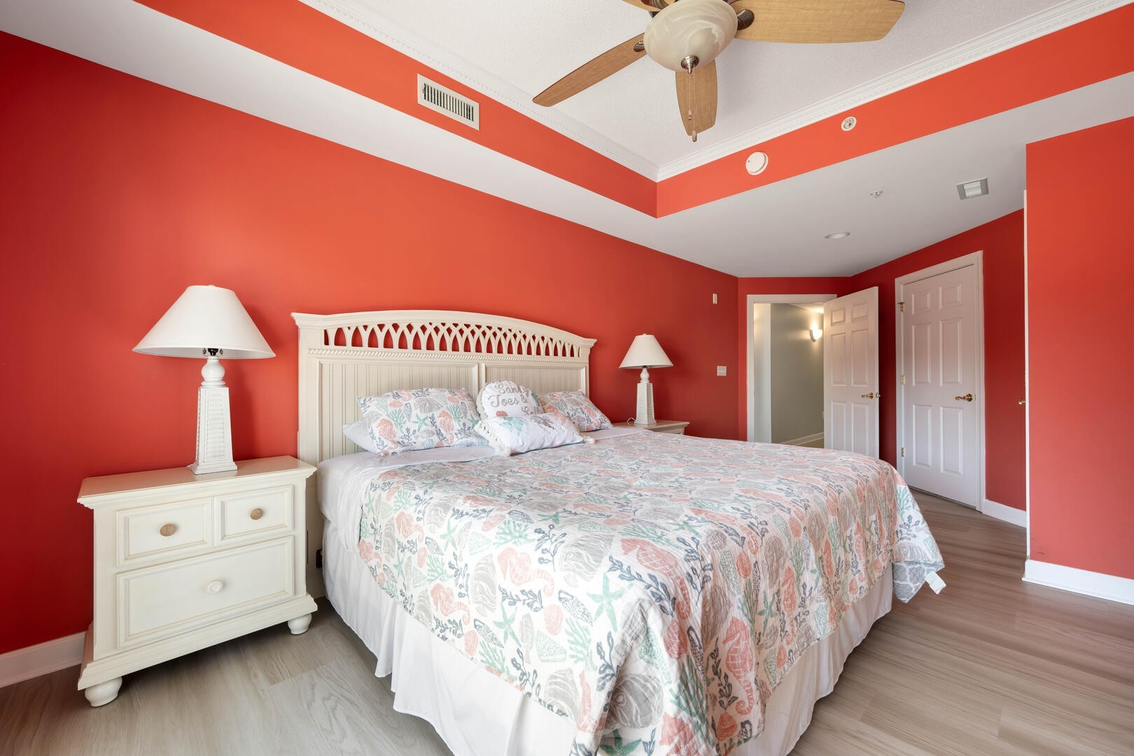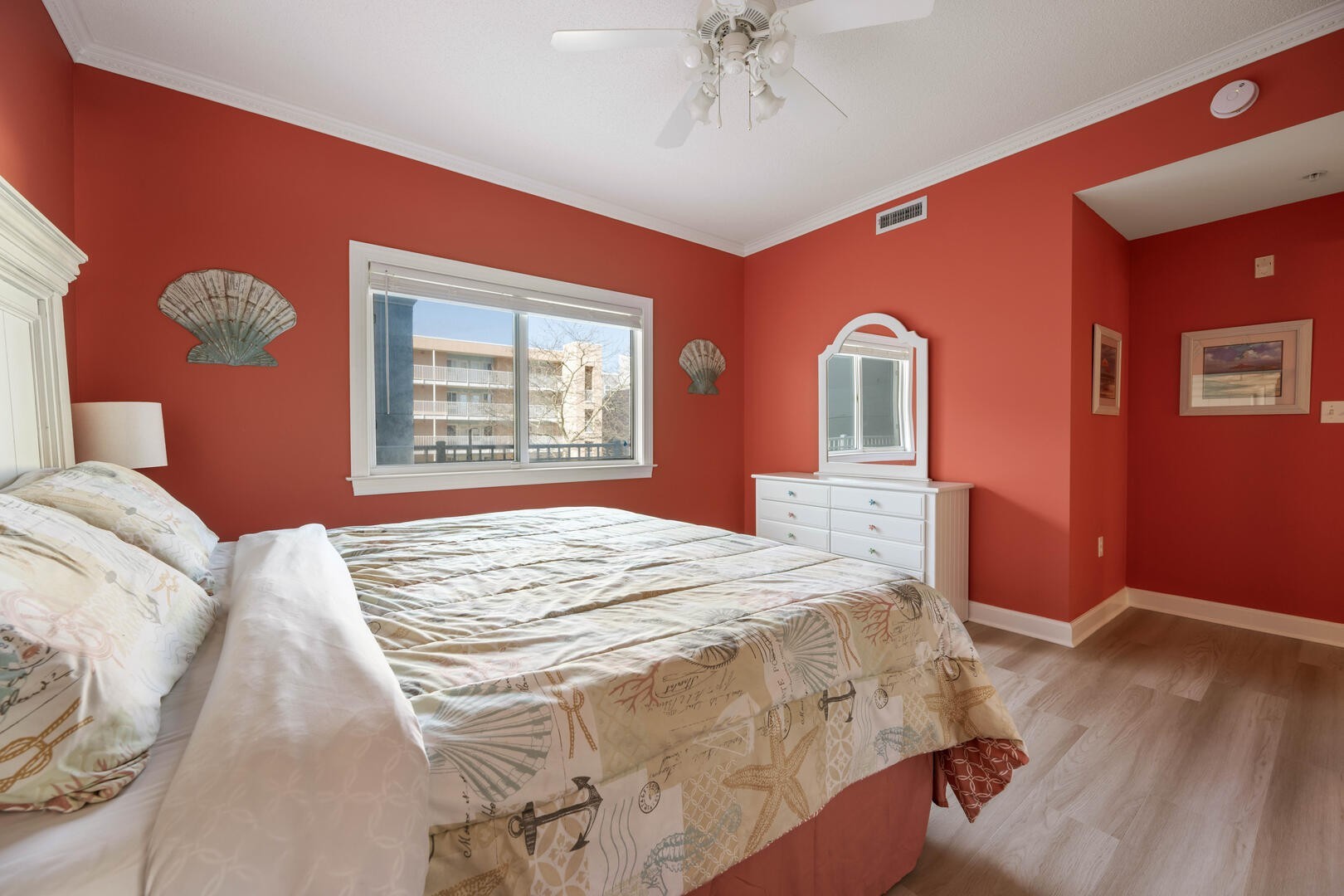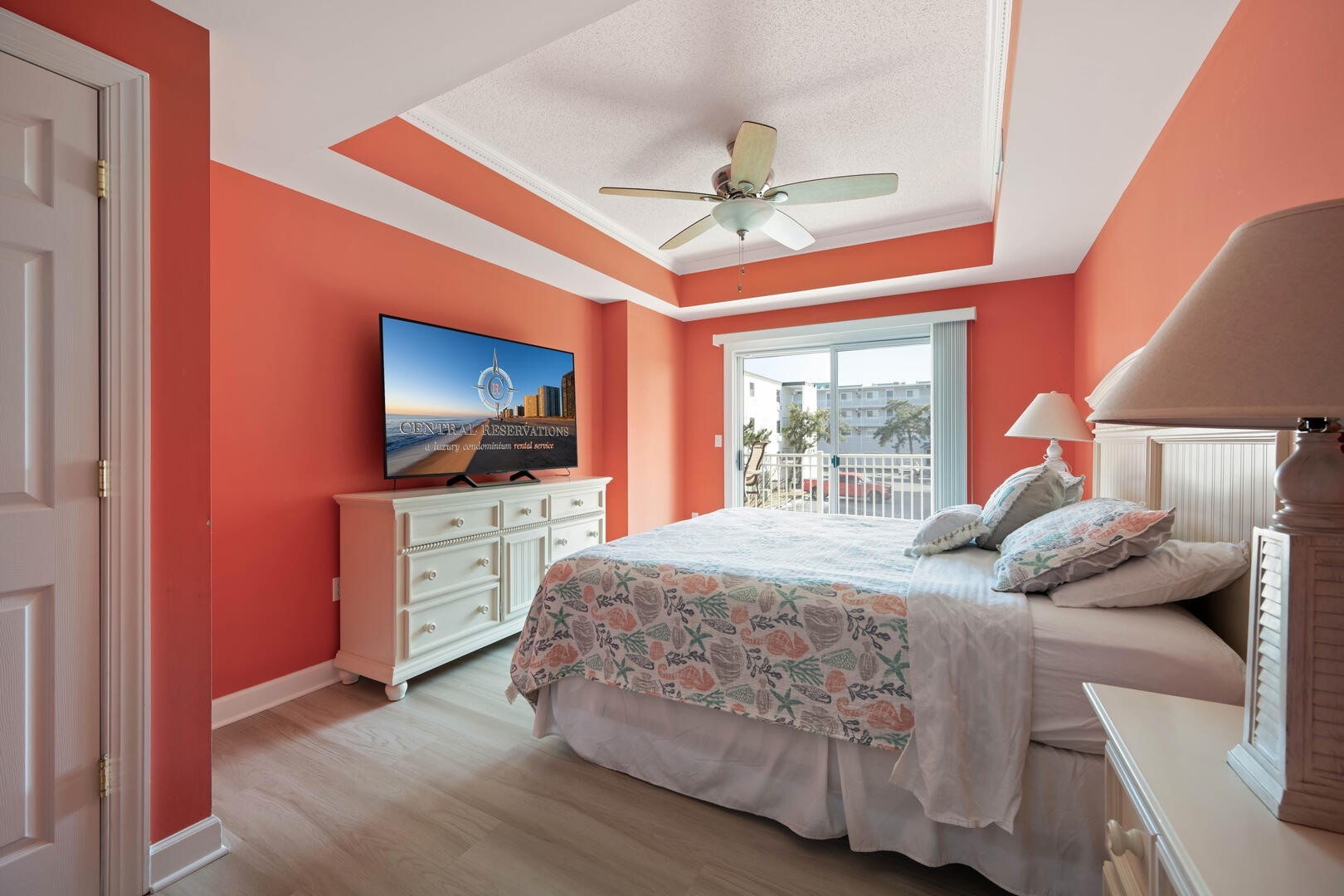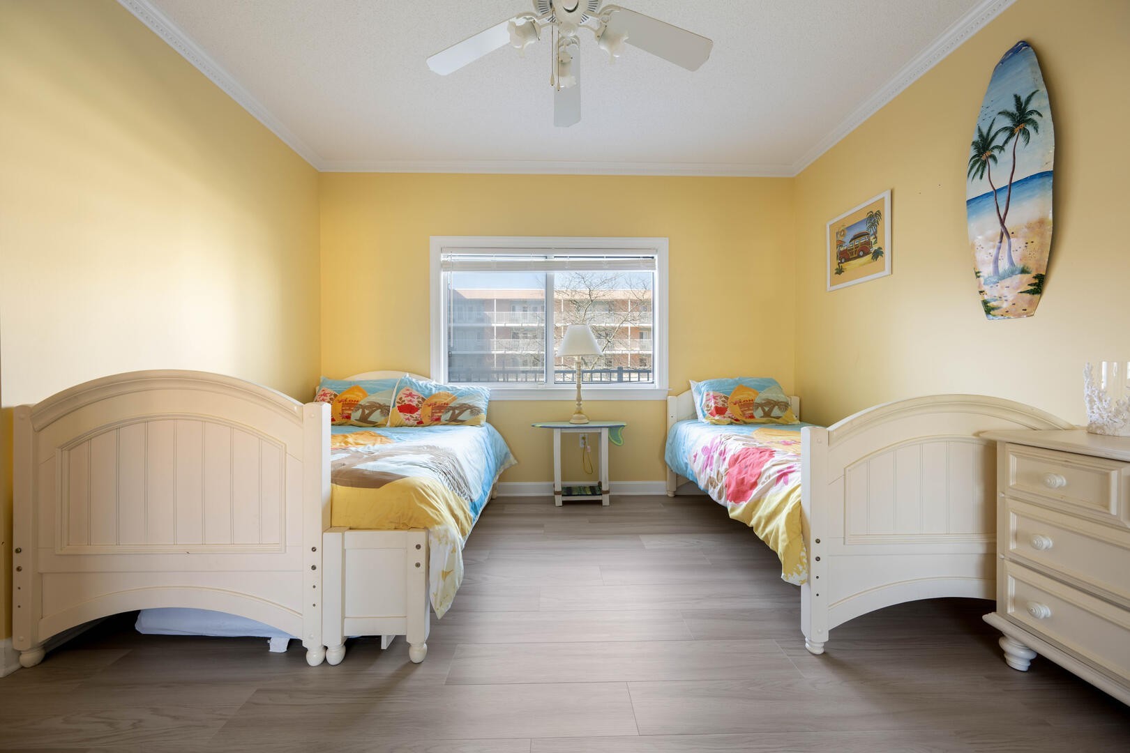 The spacious primary suite is designed for true relaxation, offering a king bed, ceiling fan with light, sliders that open onto the deck with a side view of the ocean, and a luxurious ensuite bath complete with a stand-up shower, jacuzzi tub, and double vanity. The second bedroom also features a king bed, ceiling fan, private balcony access, and its own bathroom with a stand-up shower. Bedroom three offers another king bed with a ceiling fan and direct access to the hall bathroom with a tub/shower combo. The fourth bedroom is perfect for kids or extra guests, with a full bed, a single trundle, and a separate single bed, along with a ceiling fan, and it shares the hall bathroom. All bedrooms include TVs, and new flooring in the bedrooms is scheduled for February 2026, adding even more fresh comfort to this already inviting space.