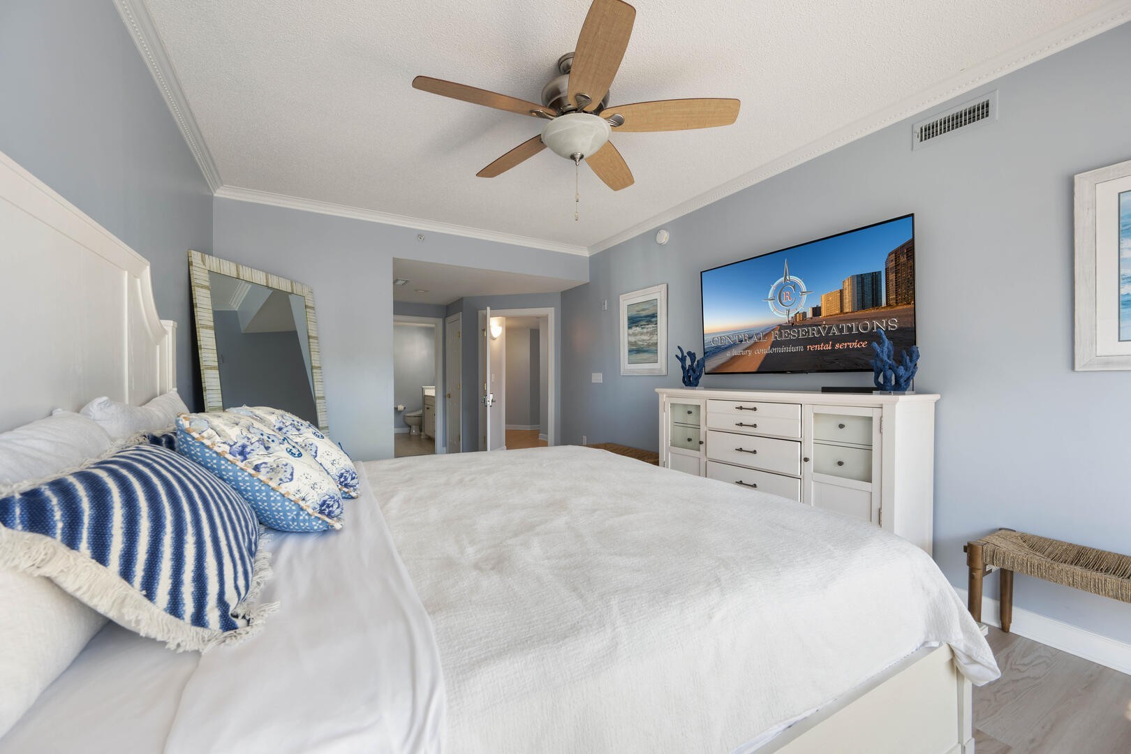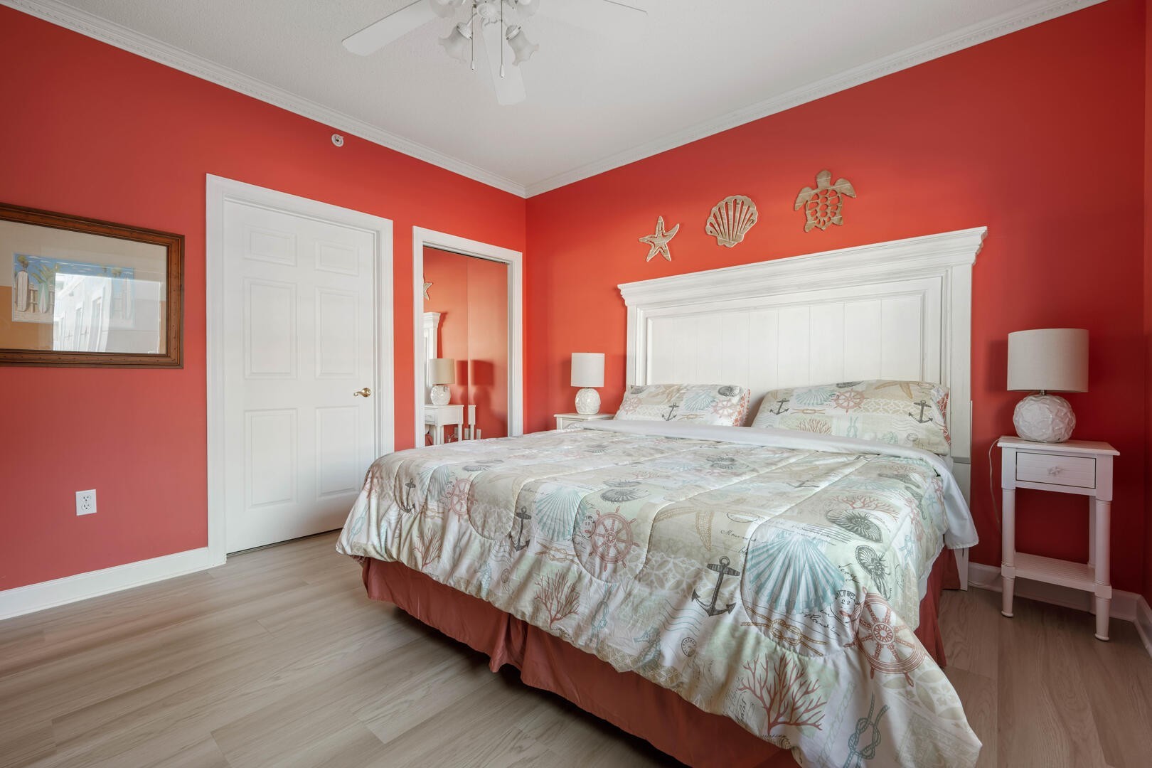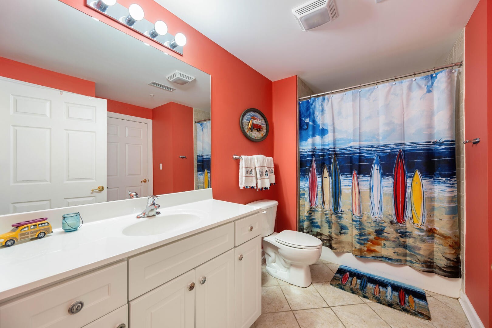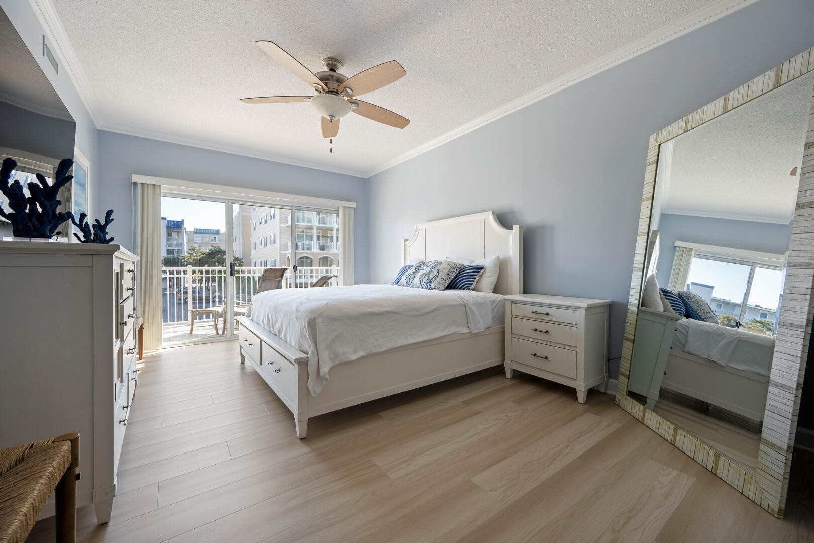 The spacious primary suite is designed for true relaxation, offering a king bed, ceiling fan with light, sliders that open onto the deck with a side view of the ocean, and a luxurious ensuite bath complete with a stand-up shower, jacuzzi tub, and double vanity. The second bedroom also features a king bed, ceiling fan, private balcony access, and its own bathroom with a stand-up shower. Bedroom three offers another king bed with a ceiling fan and direct access to the hall bathroom with a tub/shower combo. The fourth bedroom is perfect for kids or extra guests, with a full bed, a single trundle, and a separate single bed, along with a ceiling fan, and it shares the hall bathroom. All bedrooms include TVs, and new flooring in the bedrooms is scheduled for February 2026, adding even more fresh comfort to this already inviting space.